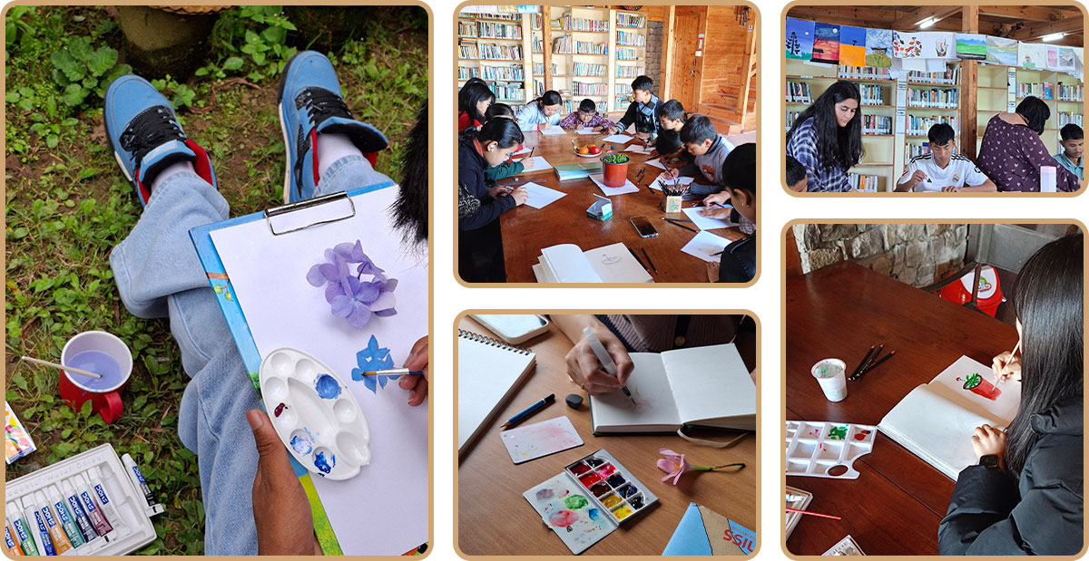As the name suggests ‘Kala Ghar’ means ‘Art House’, envisioned to provide space for potential writers, artists and thinkers to lead workshops/talks/discussions for communities and children. Local artists like Suveksha Pradhan, Carien Rai and Ashok Rai generously volunteer their time to conduct regular sessions for children and young adults. We've also had Dr. Smriti Basnett a glaciologist, and Sartaj Singh, a wildlife biologist and conservationist artist for a special session on climate change immediately after the devastating Glacial Lake Outburst Flood (GLOF) event of September 2023. Recently Hemlata Pradhan, a renowned botanical artist from Kalimpong led a workshop for students from five government schools on nature journaling.